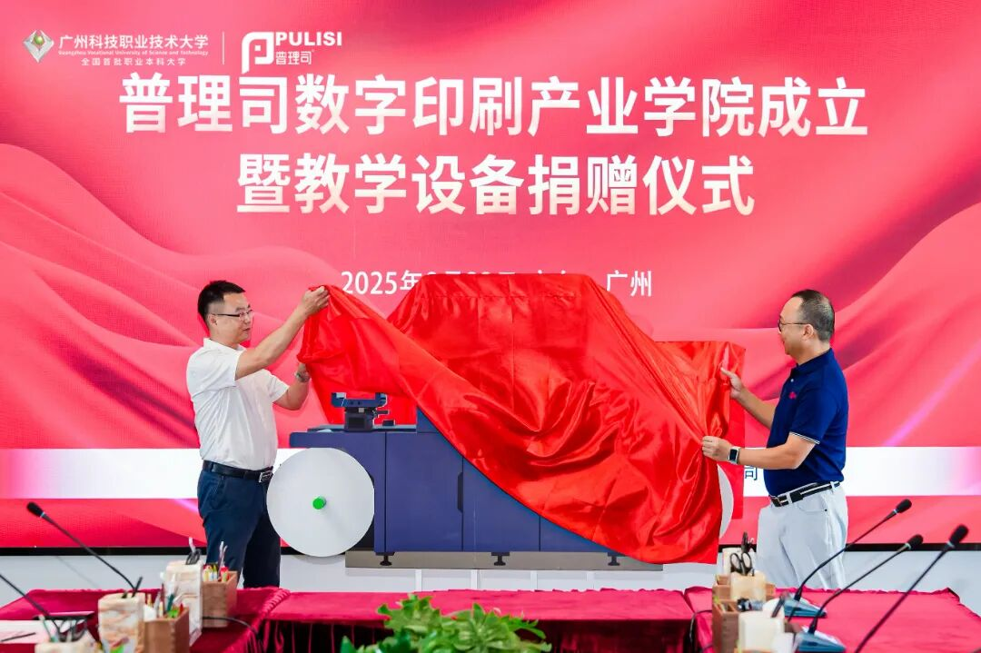 在與會領(lǐng)導(dǎo)、師生代表的共同見證下,廣州市普理司科技有限公司董事長林小博與廣州科技職業(yè)技術(shù)大學(xué)副校長張浩正式簽訂了“普理司數(shù)字印刷產(chǎn)業(yè)學(xué)院”的戰(zhàn)略合作協(xié)議,為校企深度合作定下了總框架。隨后,雙方領(lǐng)導(dǎo)共同上臺揭開“普理司數(shù)字印刷產(chǎn)業(yè)學(xué)院”牌匾,標(biāo)志著雙方正式開啟合作共贏、共謀發(fā)展的新征程。