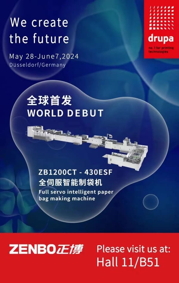 “我們從2012年第一次參加德魯巴,到這屆已經是我們第三次來參展了。第一次展出只有100多平方米,帶了一臺100多萬的自動機(相當于現在的半自動設備),當時國外的客戶對我們的產品沒什么印象;第二次展出在2016年,那時我們帶來了一款由正博自主研發的紙袋機,具有自主知識產權,很多歐洲客戶看到后都非常驚訝,然后收獲了一大批訂單;這次我們的參展面積560平方米,帶來了三臺設備。第一臺是ZB1200CT-430ESF全伺服智能制袋機,擁有全伺服系統,帶記憶功能,定位奢侈品、精品領域;第二臺是ZB1260RS-450全自動手提袋紙袋機,這款走的是環保路線,是環保紙袋機,具有速度快、效率高等特點,以前每分鐘70個,現在可以達到100個/分鐘;還有一臺是環保袋嵌入式連線放底卡紙袋機,這臺設備將奢侈品的工藝融合到環保制袋中,主要面對高端市場,嵌入式工藝非常具有創新性,而且對精度、牢固性要求非常高。這臺機器在參展第一天,就被我們歐洲的一個老客戶簽售了。”說話間,晏小斌的喜悅之情溢于言表。