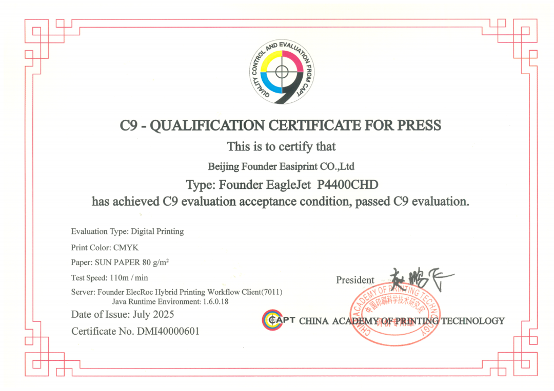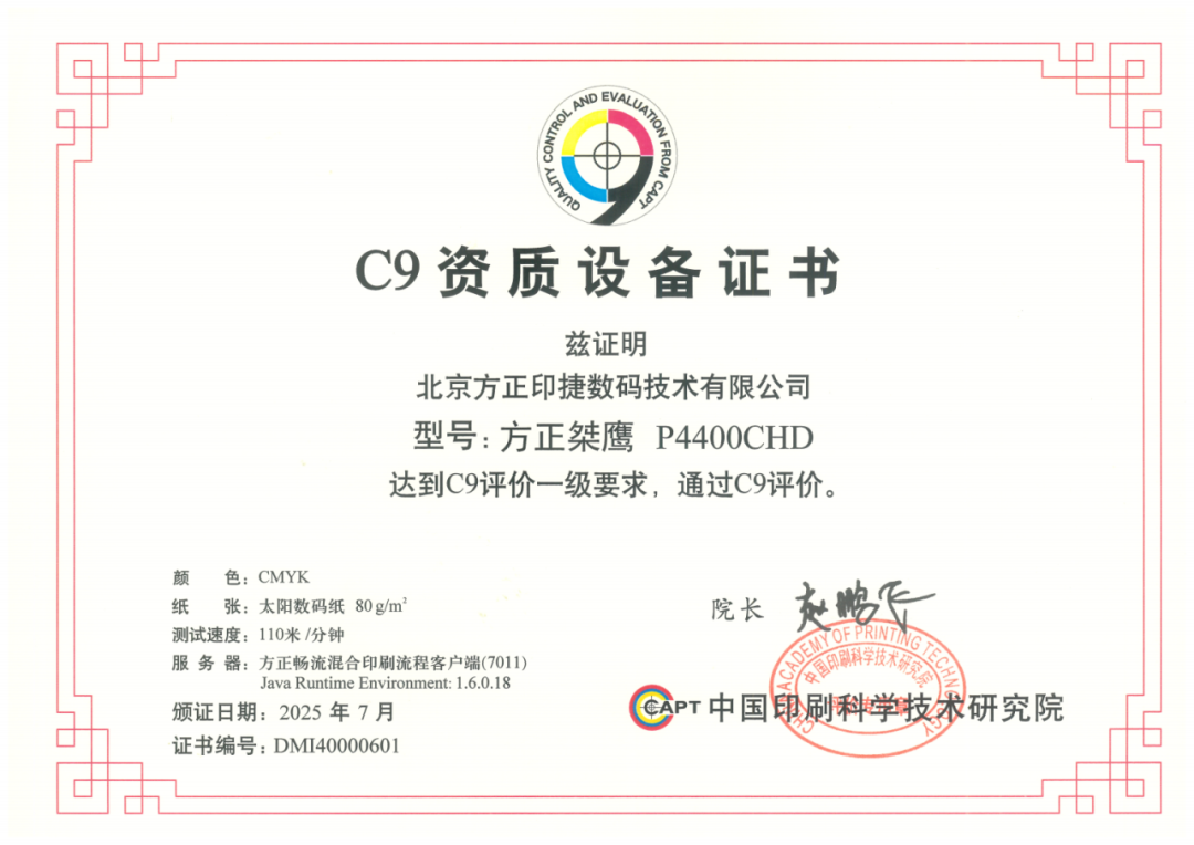 C9認(rèn)證不是貼紙,而是將嚴(yán)苛標(biāo)準(zhǔn)寫入每臺(tái)方正桀鷹設(shè)備的基因,讓國產(chǎn)噴墨直接對(duì)標(biāo)國際,把“放心、省心、信心”印進(jìn)每一張紙。