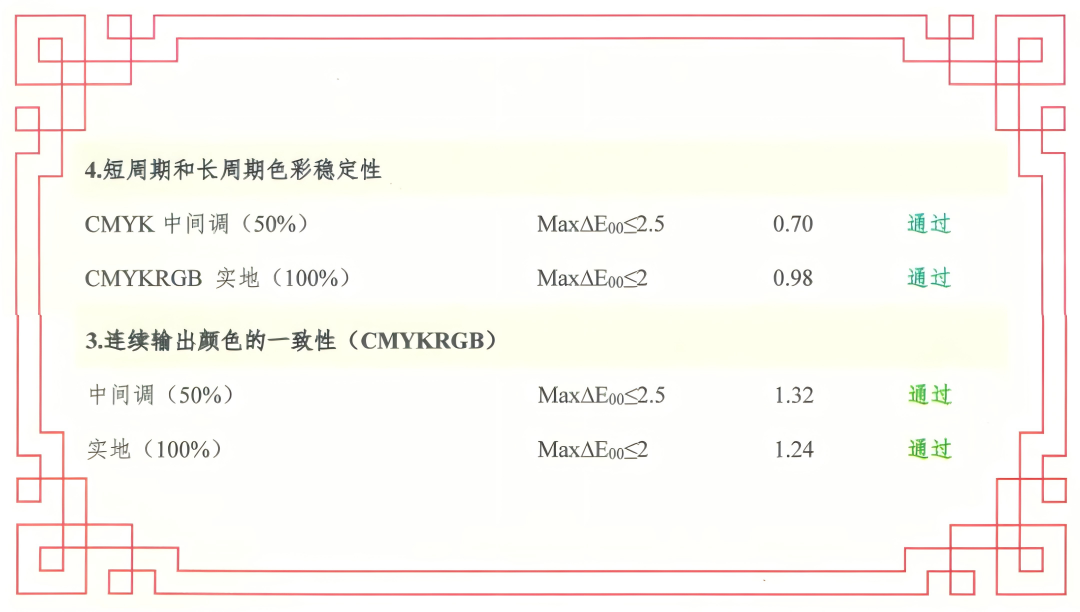 針對(duì)設(shè)備的色彩能力,還同時(shí)開展了“CMYK/RGB顏色連續(xù)性一致性評(píng)價(jià)”以及“50%中間調(diào)和100%實(shí)地顏色周期和長(zhǎng)周期色彩穩(wěn)定性評(píng)價(jià)”。