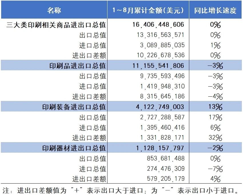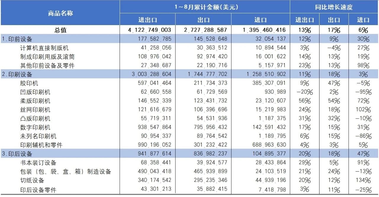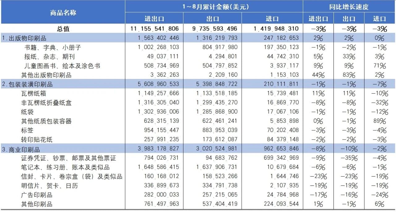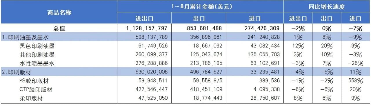 2025年1~8月國內三大類印刷相關商品進出口總體運行概況如下: