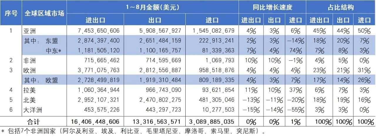 04/ 從進出口市場分布動態看,出口商品,對亞洲、歐洲、拉美、非洲市場出口保持增長,對北美、大洋洲市場出口持續下滑;進口商品,從亞洲、歐洲、拉美進口保持增長,從北美、大洋洲、非洲市場進口維持下降