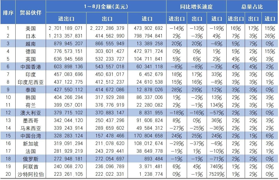 05/ 從主要進出口貿易伙伴交易額變化看,除對美國出口處同比下降狀態外,居出口前五位的其他貿易伙伴維持增長;進口前五位的貿易伙伴,從美國和新加坡進口持續下降,其余貿易伙伴進口保持同比增長