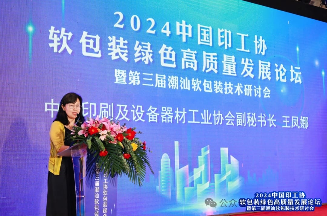中國印刷及設(shè)備器材工業(yè)協(xié)會副秘書長王鳳娜亦發(fā)表致辭。王鳳娜表示:“潮州一直被稱之為美食之都,本次活動得到了行業(yè)各個(gè)單位的大力支持,旨在探討行業(yè)高質(zhì)量發(fā)展之路,不僅承載著期待與使命,更有融合共生的責(zé)任。面對全球產(chǎn)業(yè)鏈深度調(diào)整,以及環(huán)保法規(guī)愈加嚴(yán)格、消費(fèi)者需求多元化等挑戰(zhàn),高質(zhì)量發(fā)展是企業(yè)的必然選擇也是行業(yè)的必然趨勢。2024年是新中國成立的75周年,是實(shí)現(xiàn)“十四五”規(guī)劃目標(biāo)任務(wù)的關(guān)鍵一年,也是軟包裝行業(yè)邁向高質(zhì)量發(fā)展的新節(jié)點(diǎn),希望大家能借助這一高端對話平臺,實(shí)現(xiàn)產(chǎn)業(yè)鏈協(xié)同發(fā)展,把握新機(jī)會,共繪新藍(lán)圖。最后,預(yù)祝大會圓滿成功。”