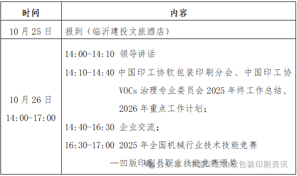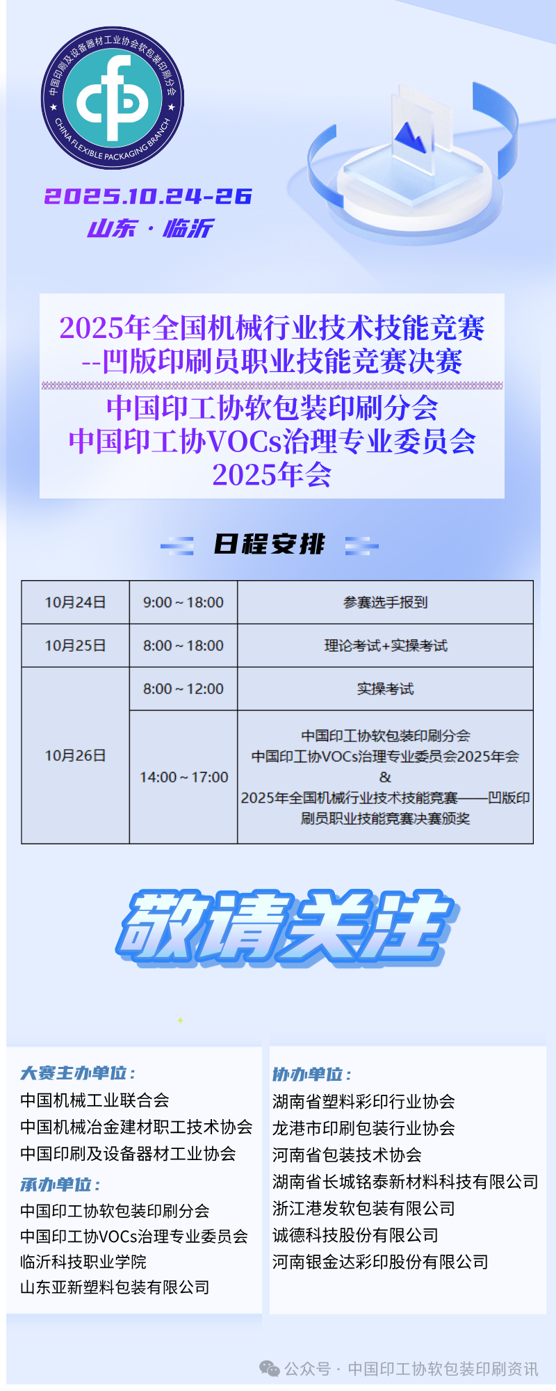 中國印刷及設備器材工業協會軟包裝印刷分會、中國印刷及設備器材工業協會VOCs治理專業委員會(以下簡稱:中國印工協軟包裝印刷分會、中國印工協VOCs治理專業委員會) 定于2025 年10月26日在山東臨沂召開年會,總結2025年工作內容,部署2026年重點工作計劃,同期還將舉辦“2025年全國機械行業技術技能競賽——凹版印刷員職業技能競賽決賽”。現將具體事項通知如下: