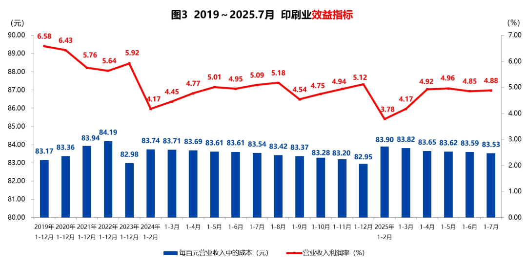 規上印刷企業的營業收入利潤率,請看紅線(見圖3)。今年以來一直在“4區間”徘徊,大家看去年同期,比今年要高些,截止7月底是升到“5區間”的。而每百元營業收入中的成本,自年初以來小步幅下行。走勢和去年差不多,數值也和去年差不多。