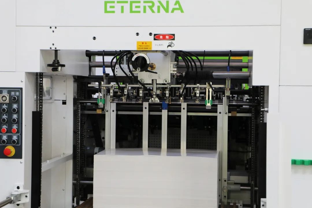 演示中心內一臺具有標志性及創新技術的重磅新品—ECUT 1050 EVO 全自動帶清廢平壓平模切機問世。
