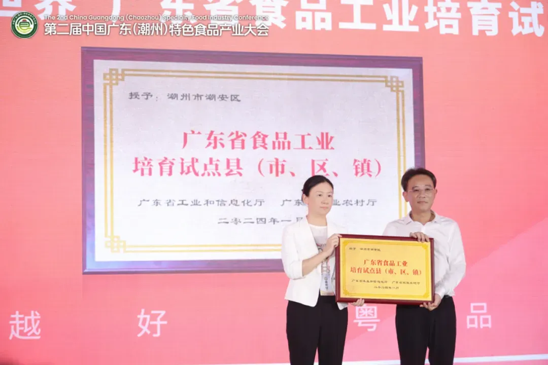 作為中國(guó)傳統(tǒng)食品產(chǎn)業(yè)創(chuàng)新升級(jí)的示范區(qū),潮州市以及潮安區(qū)特色食品產(chǎn)業(yè)也是廣東省“粵食越好 粵品世界”培優(yōu)扶強(qiáng)的重點(diǎn)食品產(chǎn)業(yè)集群之一。在第二屆“潮食會(huì)”開(kāi)幕大會(huì)現(xiàn)場(chǎng),廣東省工業(yè)和信息化廳為潮州市潮安區(qū)頒發(fā)“廣東省食品工業(yè)培育試點(diǎn)縣(市、區(qū)、鎮(zhèn))”牌匾,助力潮安區(qū)特色食品產(chǎn)業(yè)發(fā)展再提速。